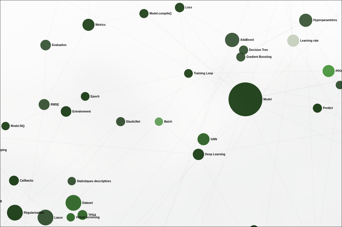Au-delà de son usage dans un pipeline RAG, un graphe de connaissances offre une valeur propre pour l’exploration visuelle d’un corpus. Parcourir le graphe à la main permet de repérer des connexions inattendues entre concepts, d’identifier les nœuds centraux d’un domaine et de naviguer d’un article à l’autre par le biais des entités partagées — une forme d’exploration que ni la recherche plein texte ni le RAG vectoriel classique ne permettent aussi naturellement.