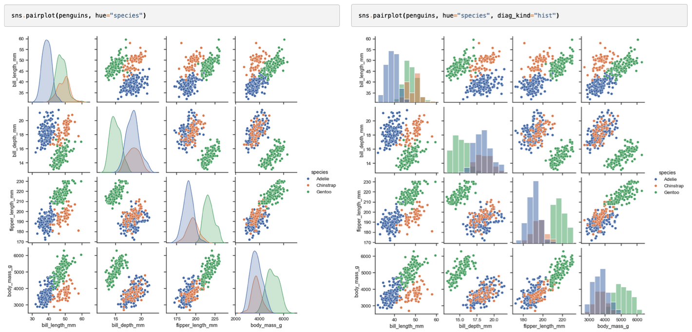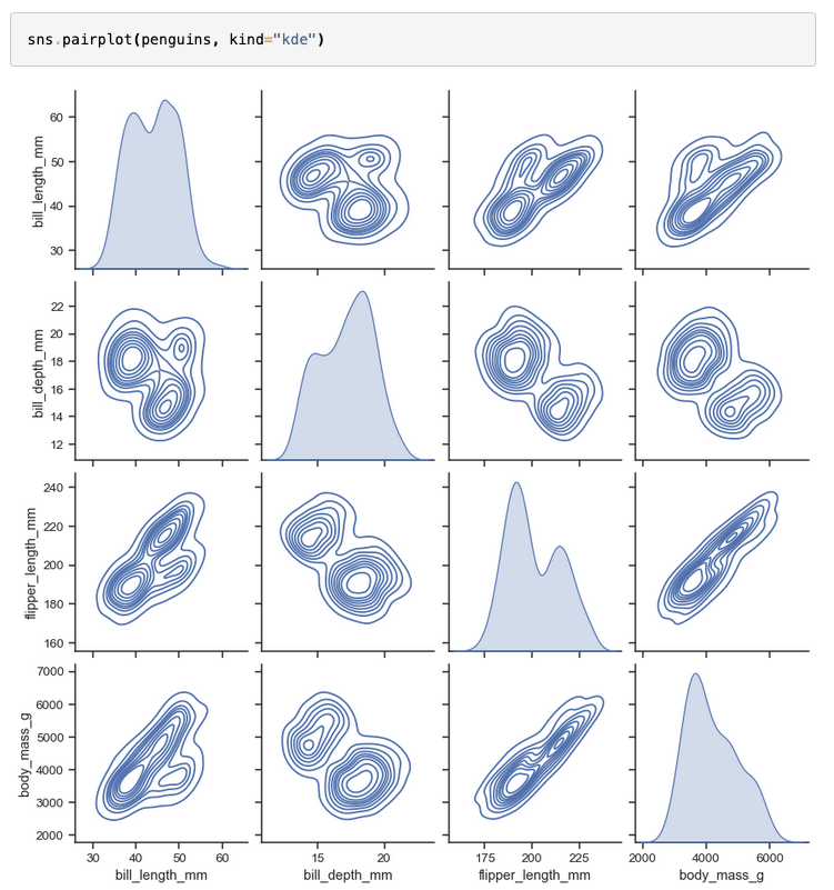 The kind parameter determines both the diagonal and off-diagonal plotting style. Several options are available, including using kdeplot() to draw KDEs:
