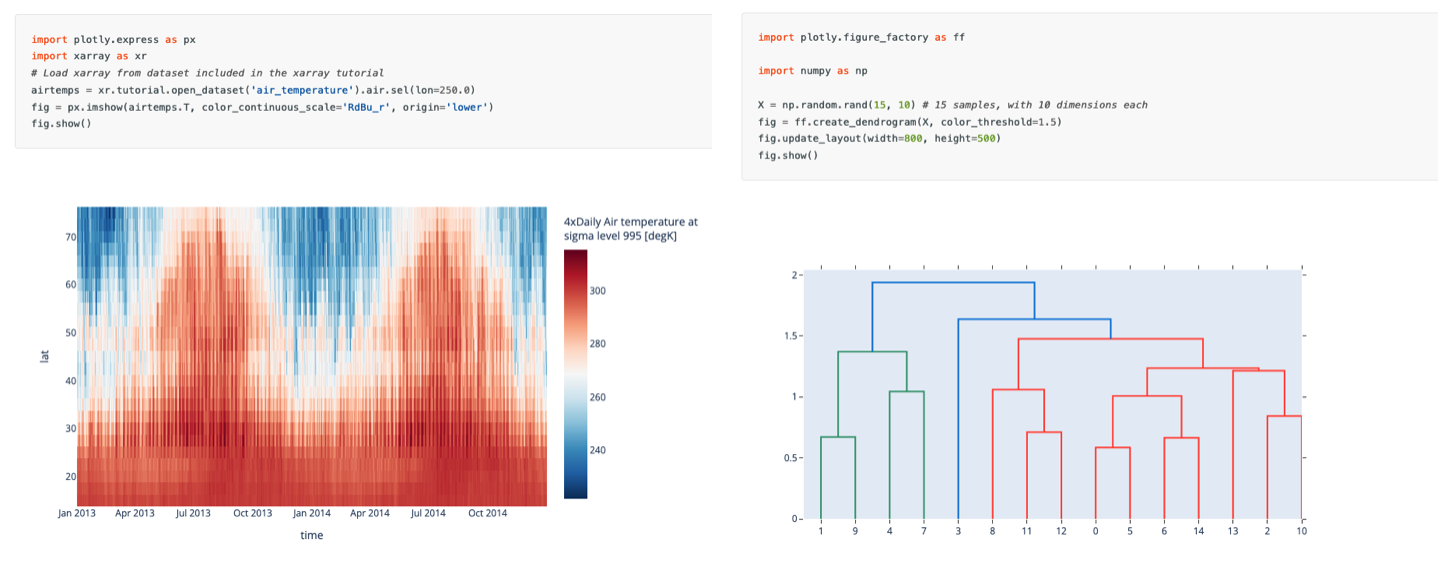 Pandaspour la simplicité, l’analyse exploratoire primaireMatplotlibpour des graphs complets et entièrement personnalisables (examples)Seabornpour de l’exploration statistique (examples)plotlypour des graphs interactifs.